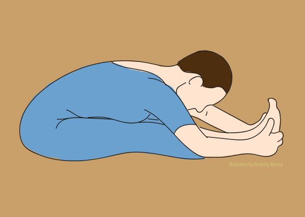 Aşează-te pe genunchii poziţionaţi la nivelul lăţimii umerilor şi mâinile la spate. Încet flectează trunchiul anterior şi coboară maximal capul. Menţine această poziţie timp de 3-4 minute, cu pauze, respirând adanc şi uniform, în timp ce simţi spatele complet relaxat.
