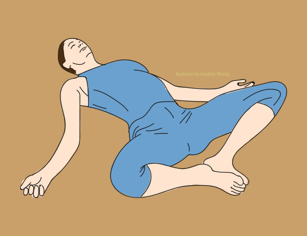 Aşează mâna dreaptă pe genunchiul stâng şi mâna stângă la spate. Întoarce foarte lin corpul spre stânga. Efectuează respiraţii profunde. Apoi, reia domol poziţia iniţială. Ar trebui să-ţi simţi muşchii abdominali laterali şi cei oblici extinşi. Repetă pe partea opusă.