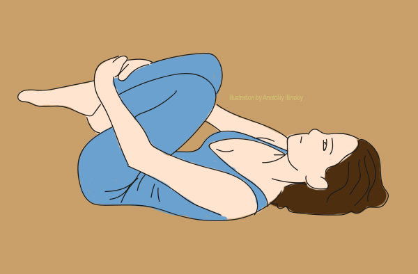 Întinde-te pe spate, îndoind genunchii şi încrucişând gleznele. Ține ferm genunchii cu mâinile, în timp ce extinzi mușchii coapselor și spatelui.