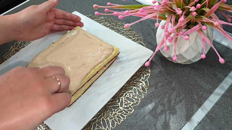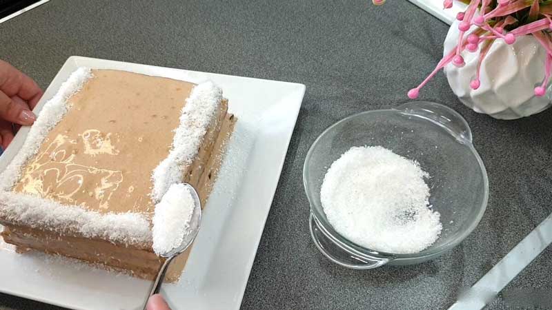 Ung blaturile racite cu crema, asezand-le una peste alta. Asigurați-vă că ungeți „laturile” prajiturii cu crema, astfel încât să se înmoaie mai bine. La final, puteti decora cu fulgi de nuca de cocos.
