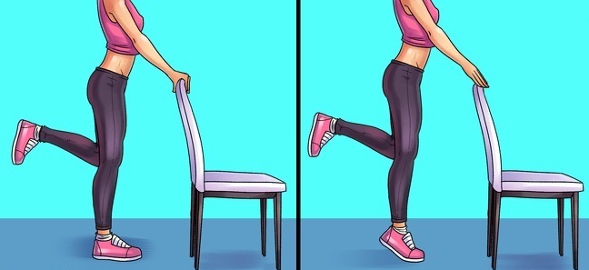 Pentru început, aveți nevoie de un scaun. Stați în spatele lui și ridicați unul dintre picioare.Ridicați încet călcâiul celuilalt picior până când vă așezați pe degetele de la picioare.Scoateți încet călcâiul de pe podea.Repetați acest exercițiu de 10-15 ori pe fiecare picior. Acest exercițiu vă va întări gleznele și va lucra mușchii din jurul genunchiului.