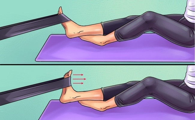 Pentru acest exercițiu următor veți avea nevoie de o bandă de rezistență.Fixați banda în jurul piciorului canapelei sau în orice altă piesă mobilă.Puneți unul din picioare sub celălalt, îndoind ușor genunchii.Prindeți bandă de rezistență cu piciorul.Trageți încet banda, îndoind piciorul spre cap.Repetați acest lucru de 10-15 ori pe fiecare picior.