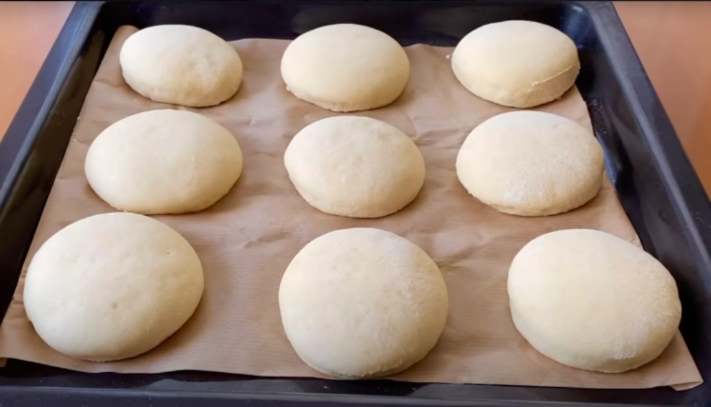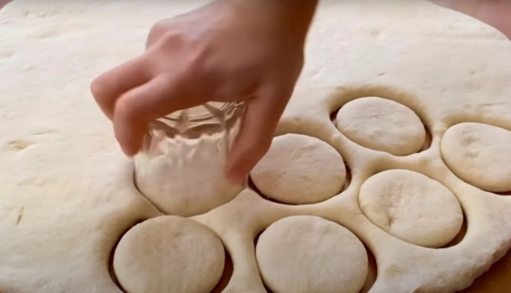 Întindem aluatul astfel încât să aibă o grosime de 1 cm, și tăiem cercuri cu un pahar sau cu un pahar.