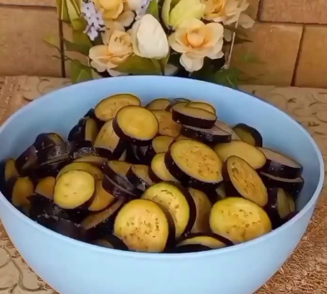După acest timp, stoarce ușor vinetele și tamponează-le cu prosoape de hârtie. Prăjește-le apoi pe ambele părți într-o tigaie până devin aurii.
