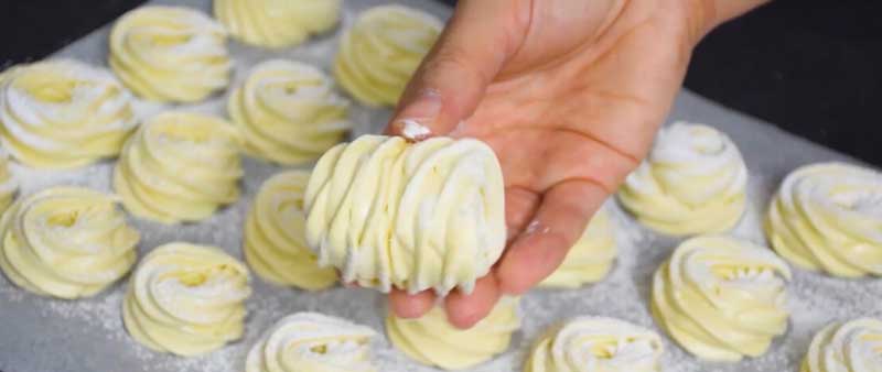 A doua zi, presărăm bezelele cu zahăr pudră – astfel va fi mai ușor de lucrat. Puteți amesteca cu amidon de porumb în proporție de 1:1.