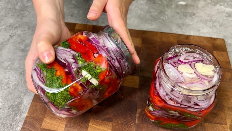Luăm borcane curate și le punem, în straturi, în următoarea ordine: rondele de ceapă (orice ceapă este buna dar eu am folosit ceapa rosie), felii de usturoi, mărar tocat cu rondele de ardei iute și ardei gras taiat julienne. Puneti straturile de legume cât mai strâns posibil și compactați-le bine.