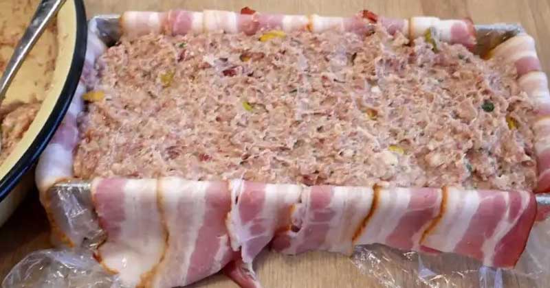 Acoperă partea de sus cu fâșii de bacon pe întreaga lungime a formei. Acoperă cu folie de plastic.