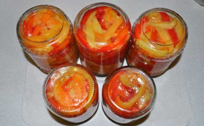 Clatim bine ardeii, le scoatem semintele si ii taiem in fasii. Inmuiem fasiile de ardei in marinada clocotita si le lasam acolo timp de 1-2 minute. Le punem apoi direct in borcane. Acoperim borcanele cu capace.