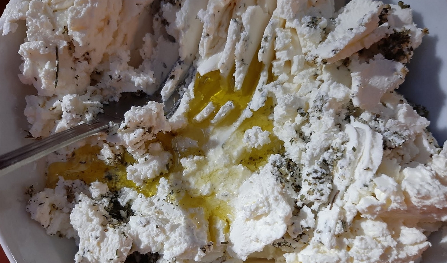 Acum punem sa ne ocupam de branza. Amestecam crema de branza si branza feta intr-un bol, adaugam ierburile preferate, usturoiul zdrobit si ierburile proaspete tocate marunt. Turnam in bol 2-3 linguri de ulei si apoi condimentam cu sare si piper.