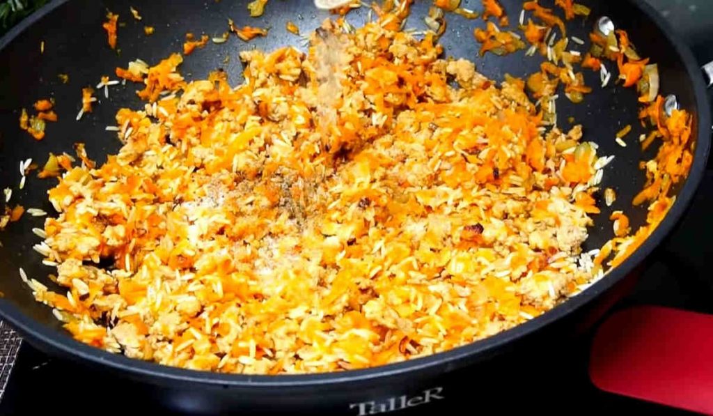 Curățăm morcovul și îl dăm prin răzătoarea mare, curățăm și tăiem ceapa în cubulețe. Călim ceapa într-o tigaie cu ulei încins până devine translucidă. Adăugăm morcovii, amestecăm și călim totul împreună timp de 2 minute.