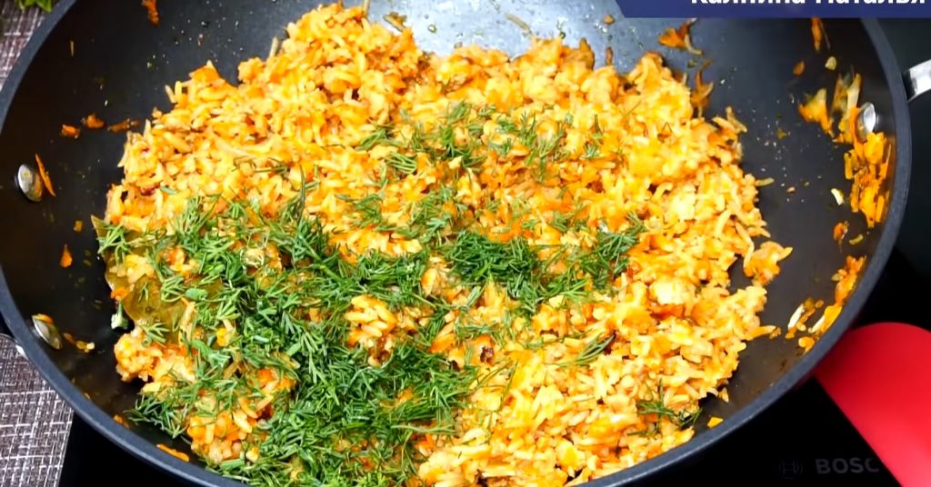 Adăugăm și apa, amestecăm și acoperim tigaia cu capac. Gătim până orezul se înmoaie, cam 10-15 minute. La final, tragem tigaia de pe foc și adăugăm și verdeața tocată mărunt.