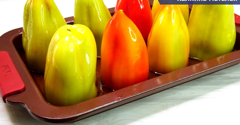 Tăiem roșiile rondele. Curățăm ardeii de cotor și de semințe și îi umplem cu umplutura pregătită. Le acoperim cu o rondea de roșie și le așezăm pe o tavă tapetată cu hârtie de copt și unsă cu ulei. Ungem ardeii cu un pic de ulei și punem un pic de apă în tavă. Dăm tava la cuptorul preîncălzit la 180 de grade pentru 50 de minute.