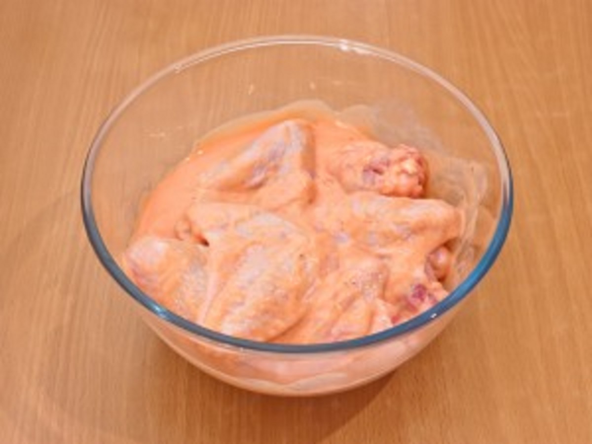 3. Adăugăm amestecul de ketchup și maioneză pregătit anterior și lăsăm la marinat 30 minute.
