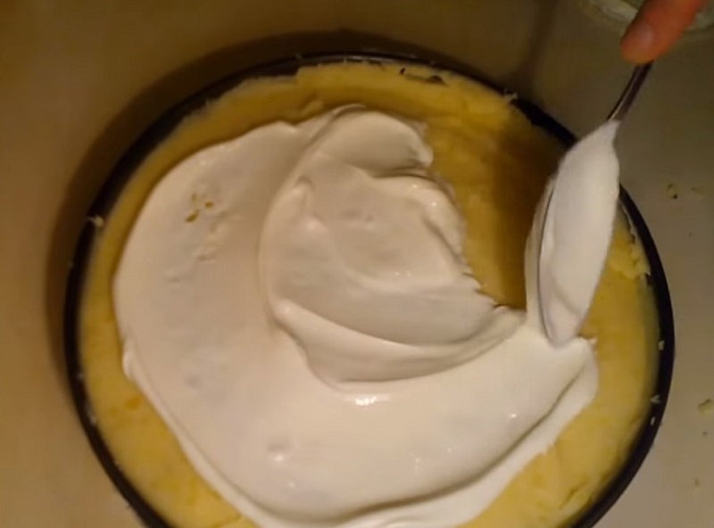 Deasupra se toarnă carnea prăjită, se acoperă cu piureul rămas, se nivelează și se unge cu 2 linguri de smântână.