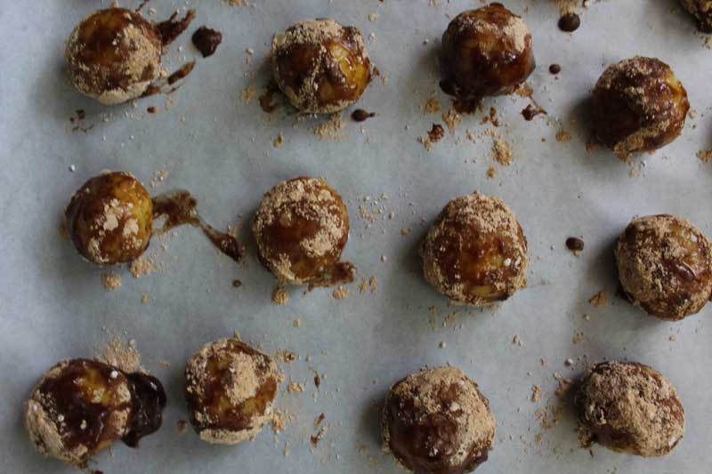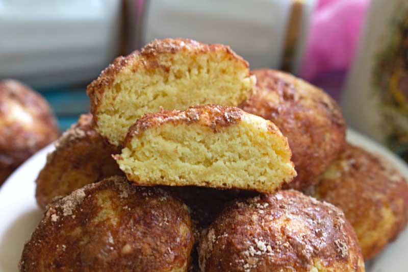 Bateți albușurile cu o furculiță. Formați bile mici din aluat, înmuiați-le în albușuri și apoi treceți-le prin amestecul de zahăr și scorțișoară.