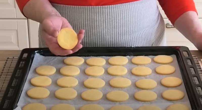 Întindeți aluatul până la o grosime de 4-5 mm și tăiați biscuiți cu un diametru de 6 cm. Puneți-i pe o tavă de copt acoperită cu hârtie de copt.
