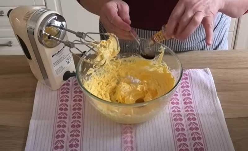 Gătiți zahărul și apa într-un sirop, apoi adăugați-l la gălbenușurile bătute. Odată răcit, adăugați untul și extractul de vanilie.