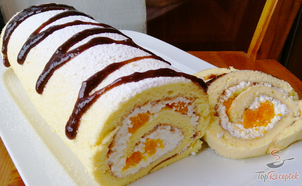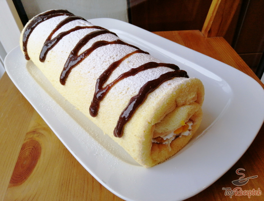 Umplem cu cremă și cu bucățelele de fructe, rulăm. Decorăm după gust.