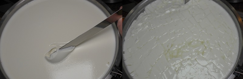Fie pasteurizezi laptele, fie nu – încălzește-l la 37°C. Presară culturile pe suprafață, așteaptă 2 minute, apoi amestecă. Lasă 30 de minute la această temperatură – bacteriile se vor înmulți și vor scădea ușor pH-ul. (Tot acum se adaugă și clorura de calciu, dacă este cazul.)
