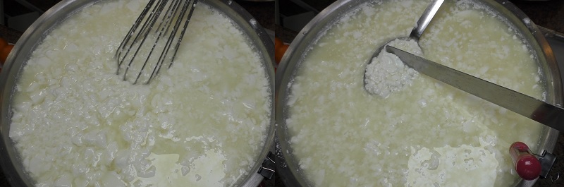 Amestecă ușor tot timpul. Dacă găsești bucăți mari, mărunțește-le. Boabele trebuie să aibă dimensiunea între un bob de mazăre și un bob de orez. La final, lasă cașul să se depună și elimină zerul.