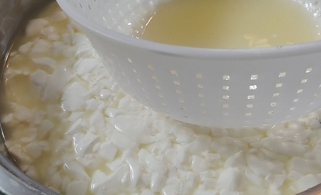 Când boabele s-au lăsat, zerul se scurge ușor – doar spre final trebuie să fii mai atent. Ideal este să folosești o sită deasă pentru a păstra masa de brânză pe partea corectă. Din zerul rămas poți face ricotta.