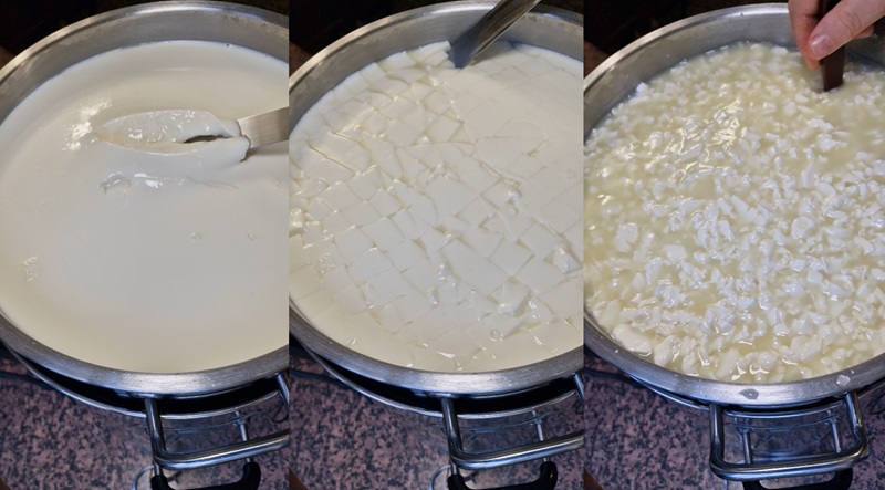 Taie coagulul în fâșii de 1–2 cm, apoi pe diagonală, până obții cubulețe. Continuă tăierea cu o lingură mare sau cu un tel. Dimensiunea finală – cât un bob de mazăre. Dacă sunt bucăți mari, le poți scoate și tăia separat.