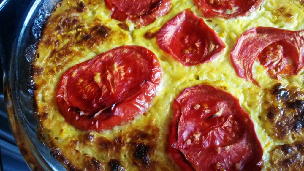 Am uns o tava cu unt (daca nu vreti tava unsa, luati una antiaderenta sau puneti o hartie de copt), am turnat compozitia si am decorat cu feliile de rosii. Depinde de cuptorul fiecaruia, insa orientativ eu am copt budinca la 180 de grade timp de 40 de minute, iar apoi inca 10 minute cu ventilatie, ca sa o bronzez si rosiile sa se coaca.