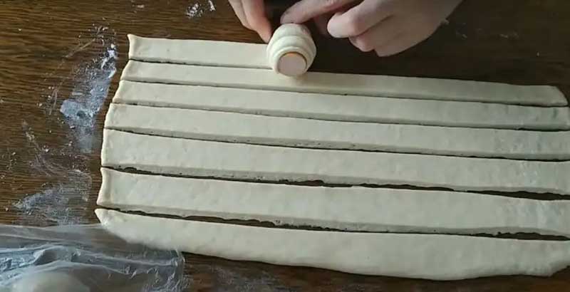 După ce aluatul a crescut bine, îl întind într-o foaie dreptunghiulară și tai în fâșii egale. Iau un cârnăcior și îl înfășor în aluat.