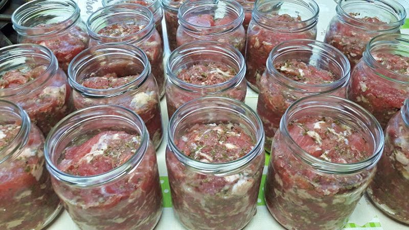 Sterilizăm 5 borcane cu gura mai largă ( nu uităm nici de capace! ), apoi le umplem, lăsând cam 2 degete loc liber, cu amestecul de carne. Îndesăm bine, să nu rămână goluri de aer în borcan. Acoperim fiecare borcan cu folie de aluminiu, înțepăm din loc în loc.
