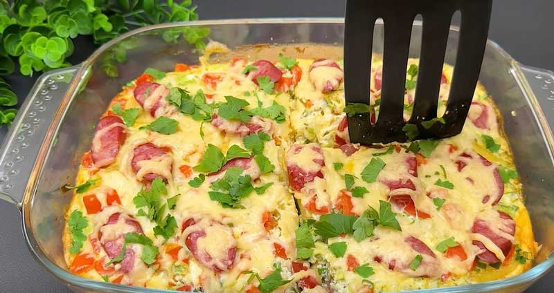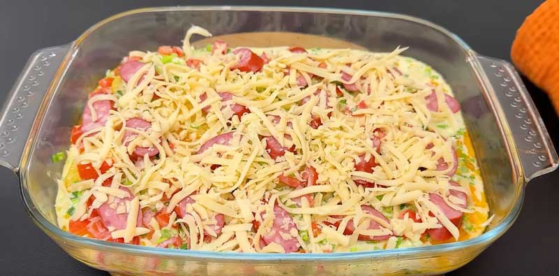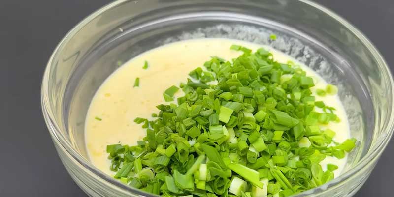 Între timp, pregătiți un amestec din ouă, smântână acră, pătrunjel și roșii cherry. Adăugați sare după gust.