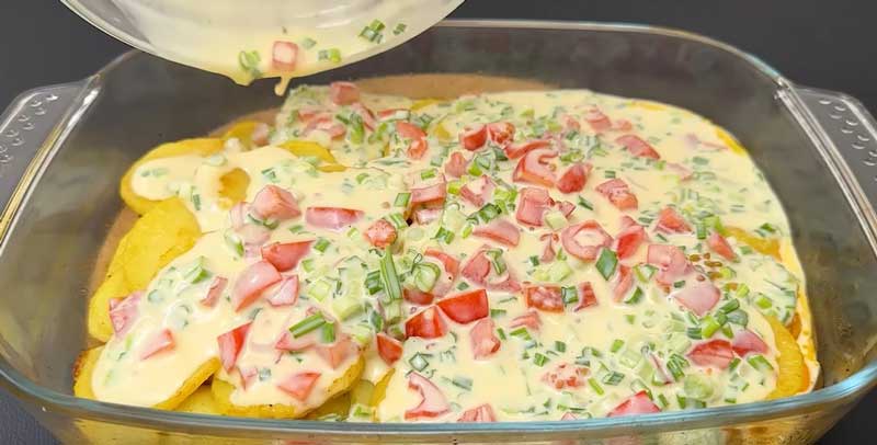 Aceasta reteta de cartofi in stil frantuzesc, pregatiti la cuptor, este absolut delicioasa iar cartofii se combina perfect cu gustul acrisor al smantanii, cu aroma rosiilor si a carnatilor. Apropo, in loc de carnati puteti folosi orice tip de carne afumata – muschiulet, pastrama, kaizer etc.