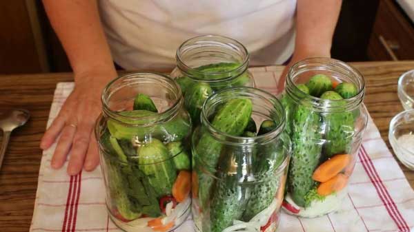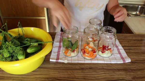 Se pregatesc toate ingredientele, se pun 3-4 rondele de ceapă, câteva felii de morcovi, usturoi și 1-2 felii de ardei iute în borcane curate (nu este necesară sterilizarea). In borcan mai punem o crenguta de mărar și o frunză de hrean, dacă se dorește.