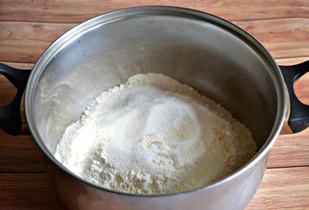 Luati o cratita incapatoare, puneti restul de zahar si faina – daca vreti sa faceti placinte dulci din acest aluat, puneti mai mult zahar (acesta ajuta aluatul sa creasca mai bine).