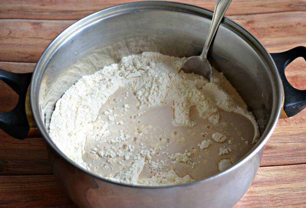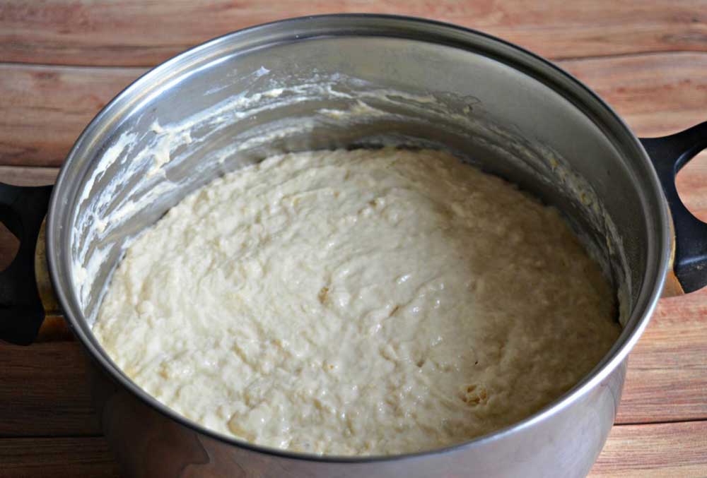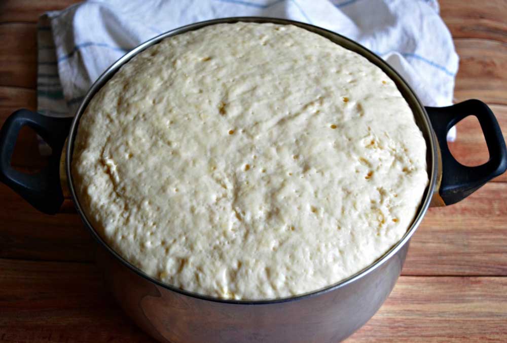 Drojdia si uleiul se pun peste ingredientele din cratita si se amesteca cu o lingura. Nu trebuie sa framantati – se lasa doar la crescut pana isi dubleaza volumul.