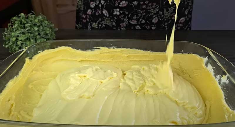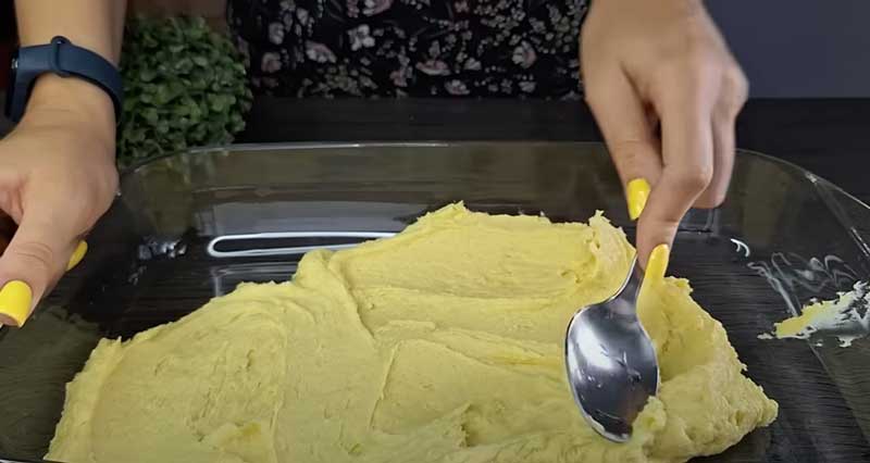 Întindeți aluatul uniform într-o tavă de copt de dimensiuni 20×30 cm.