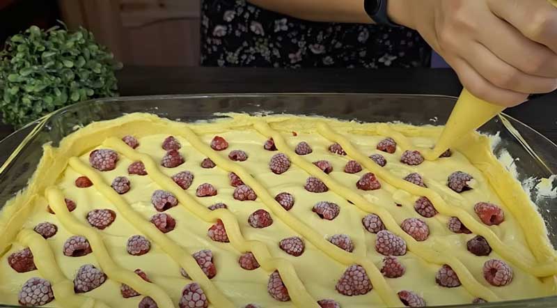 Adăugați treptat ouăle, încorporându-le bine în compoziție. Turnați amestecul de brânză peste aluatul din tavă. Adăugați zmeura deasupra.