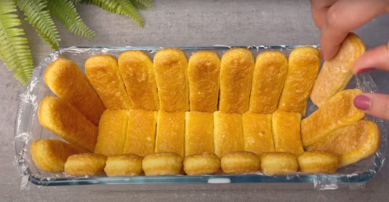 Împărțim piscoturile astfel încât să se potrivească în forma de copt, formând baza și marginile viitorului desert.