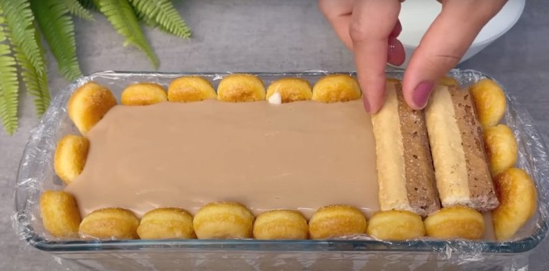 Nu uităm să distribuim uniform fiecare strat pe întreaga suprafață cu o spatulă. Acoperim partea superioară a desertului cu piscoturile rămase, înmuiate în prealabil în lapte. Lăsăm desertul în frigider timp de 4 ore.