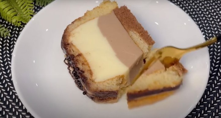 După ce ciocolata s-a amestecat complet cu crema de lapte, turnăm amestecul peste baza din piscoturi. Mai întâi turnăm compoziția cu ciocolata cu lapte, apoi pe cea cu ciocolata albă.