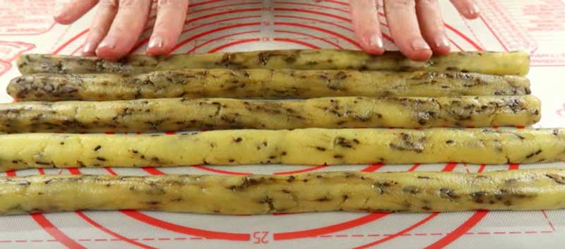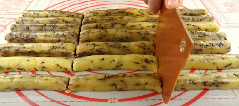 Framântă aluatul pe o planșetă și formează fursecuri lungi, pe care apoi le împarți în dimensiunea dorită. Le poti da orice forma doresti, dupa placul tau.