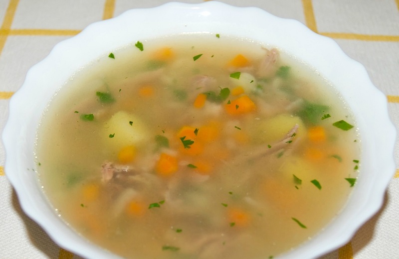 3. Într-o oală curată, adăugăm zeama pregătită anterior, carnea de pui, 1 morcov, 2 cartofi și fierbem la foc mic.