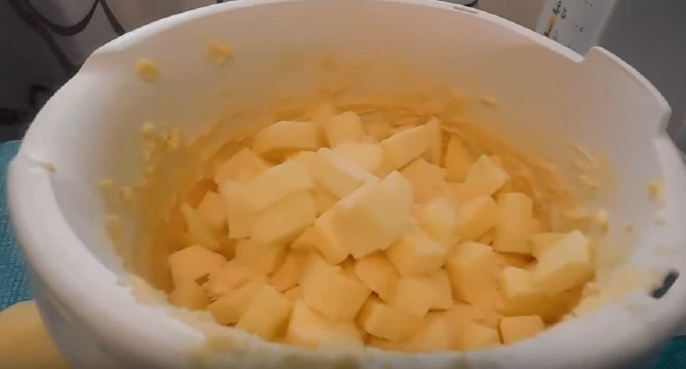 1. Cu ajutorul unui mixer, batem untul spumă. Adăugăm zahărul, zahărul vanilat și amestecăm bine.