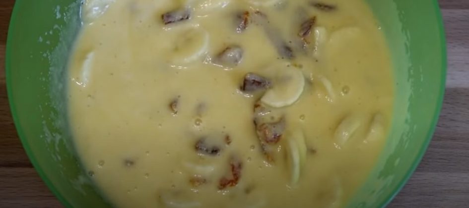 Tăiem pai caisele iar bananele rondele, după care e adăugăm în compoziție și amestecăm.
