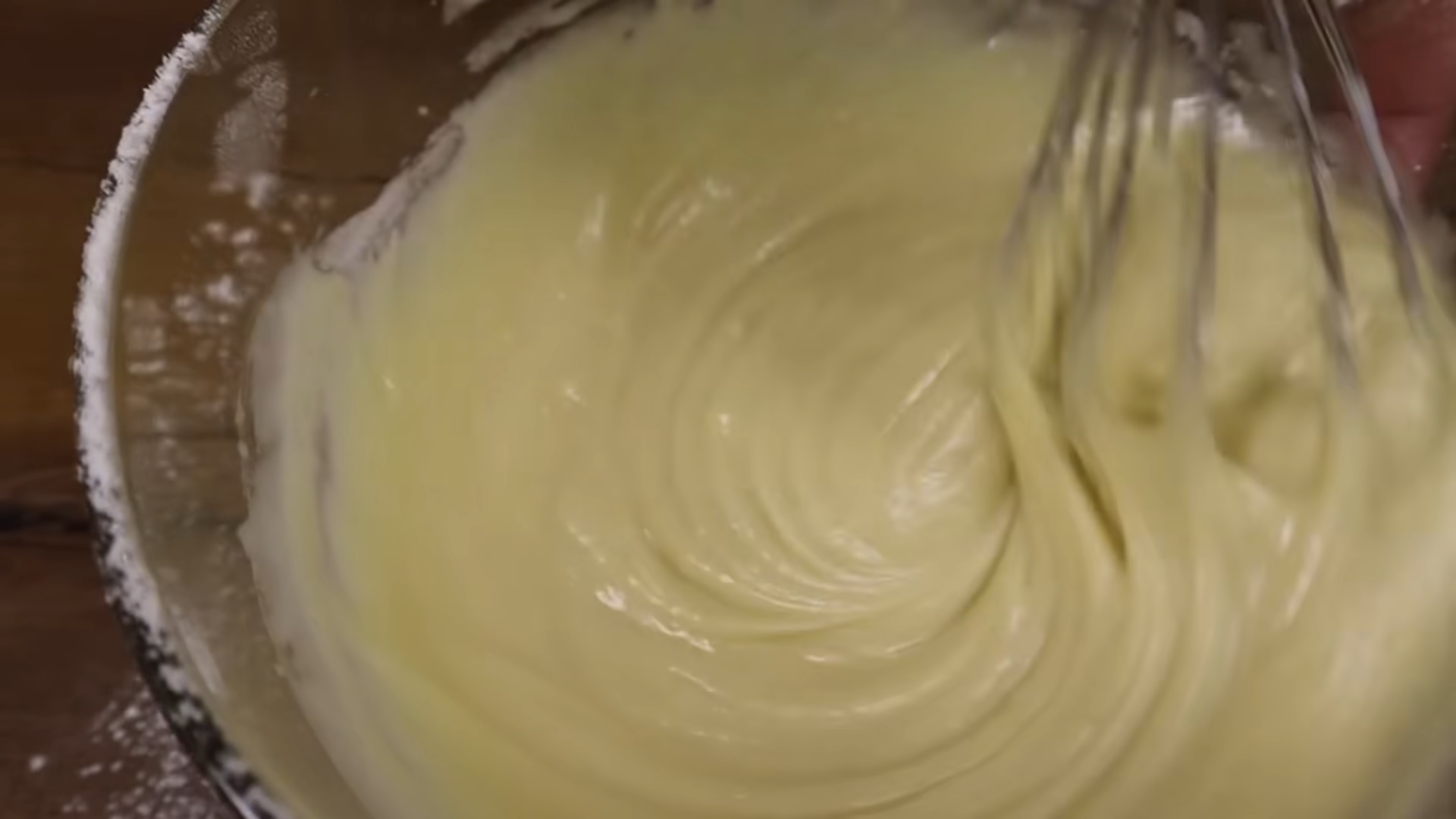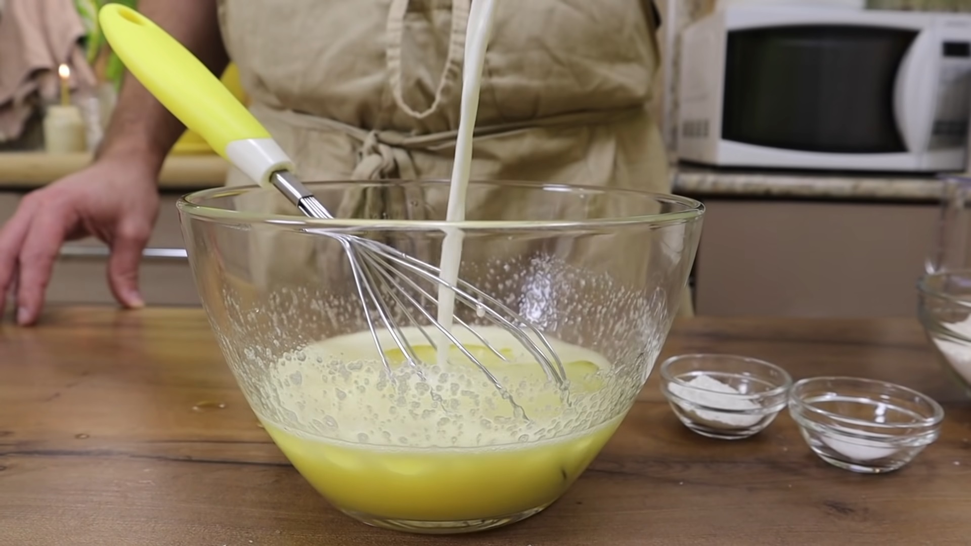 Spargem ouăle într-un bol. Adăugăm zahărul și amestecăm bine cu telul. Adăugăm uleiul, laptele și omogenizăm.
