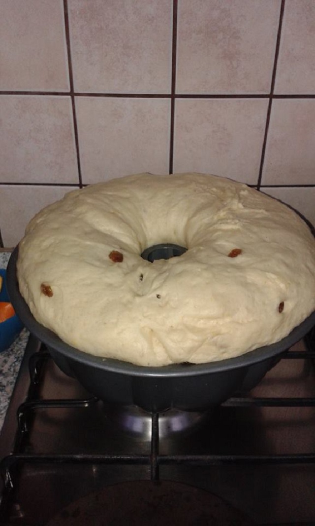 Transferăm în forma rotundă și lăsăm la dospit, la loc cald, timp de 1 oră.