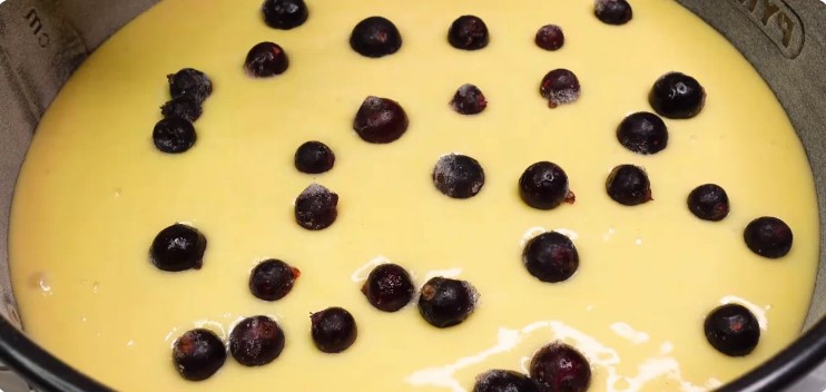 Tapetam cu hartie de copt o forma de 20 cm si o ungem cu unt, turnam aluatul si presaram fructe de padure congelate – ce aveti prin congelator sau ce va place mai mult. Este bine sa dati fructele prin faina inainte de a le pune in aluat deoarece nu se vor mai lasa la fund.