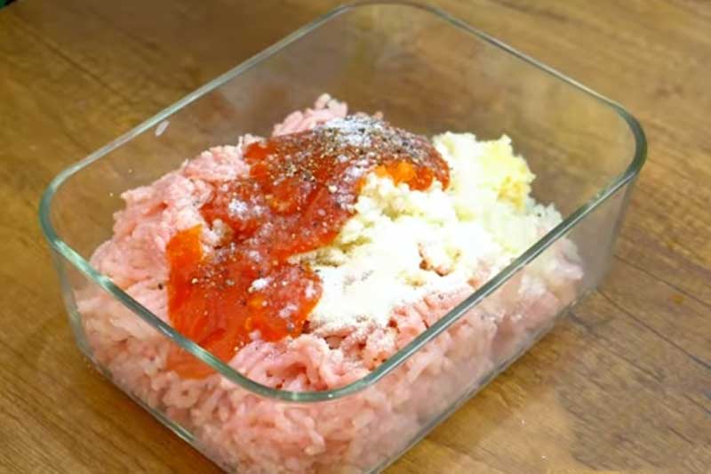 Adăugați în carnea de pui tocată ceapa, usturoiul, grișul, 3 linguri de ketchup (rezervați 1 lingură), oul, busuiocul, sare, piperul și sosul Worcestershire (dacă folosiți). Amestecați bine toate ingredientele și lăsați amestecul în frigider timp de 30 de minute, pentru ca grișul să se umfle.