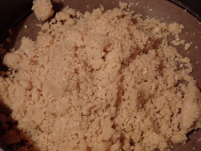 Intindem amestecul obtinut pe fundul unei tavi rotunde cu diametru de 24 cm. Bagam tava in frigider.
