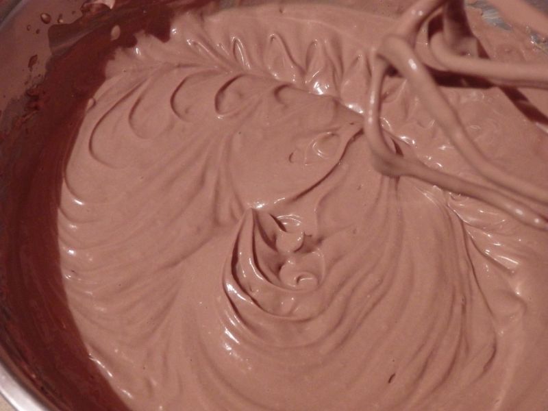 Pregatim umplutura de ciocolata. Dizolvam ciocolata la bain-marie si o lasam sa se raceasca. Adaugam ciocolata topita in crema de branza. Amestecam bine cu un mixer.