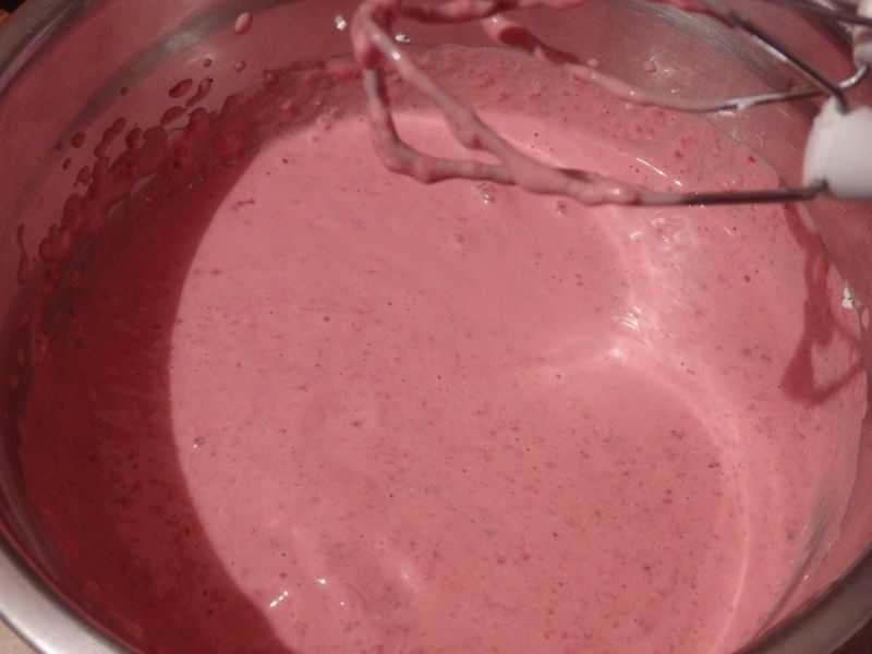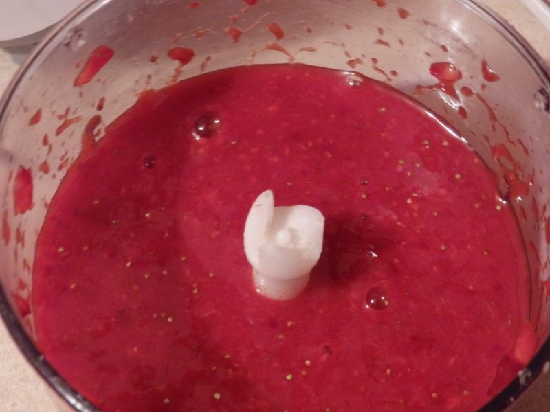 Pregatim umplutura de caspuni. Amestecam crema de branza cu zaharul vanilat. Capsunile le dam printr-un blender pentru a obtine un mousse.